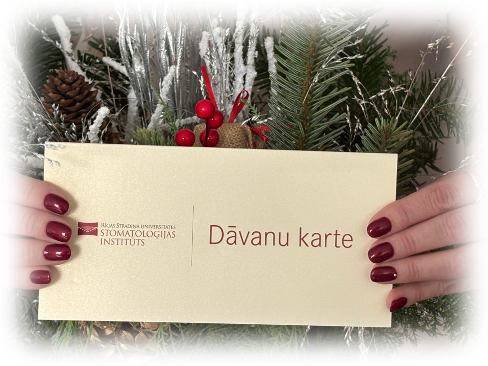 Aktualitātes Iepriecini svētkos dāvinot veselu smaidu! Brīnišķīga dāvana svētkos ir veselīgs smaids. Dāvinot iespēju parūpēties par mutes veselību un veselīgu, skaistu smaidu, Jūs varat iepriecināt savu ģimeni, mīļos, draugus un kolēģus. RSU Stomatoloģijas institūta dāvanu kartes nopērkamas reģistratūrās Stomatoloģijas institūtā Dzirciema ielā 20, Implantoloģijas klīnikā Baznīcas ielā 31, un Ortodontijas studiju un pētniecības centrā Antonijas ielā 9.Dāvanu kartes izmantojamas norēķiniem visās Institūta klīnikās.