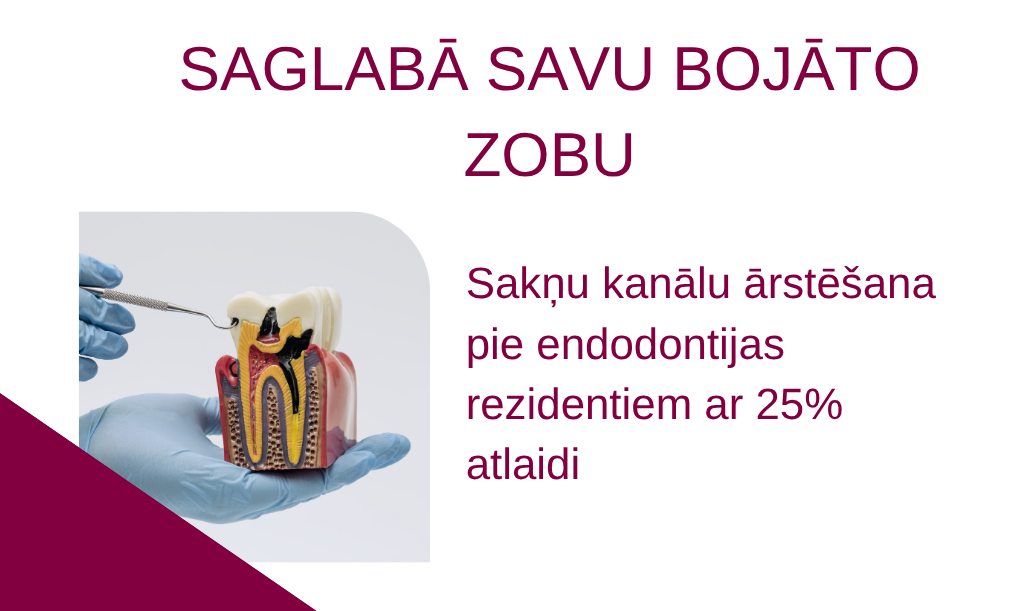 Aktualitātes Sakņu kanālu ārstēšana ar 25% atlaidi pie endodontijas rezidentiem Rīgas Stradiņa universitātes Stomatoloģijas institūts piedāvā iespēju veikt sakņu kanālu ārstēšanu (endodontiju) ar 25% atlaidi pie endodontijas rezidentiem. Kas ir endodontija? Endodontija ir zobu sakņu kanālu ārstēšana – procedūra, kas palīdz saglabāt dabīgo zobu gadījumos, kad bojājums ir sasniedzis zoba iekšējos audus (nervu) vai saknes gala audus. Savlaicīgi veikta ārstēšana ļauj izvairīties no zoba zaudēšanas un novērst iekaisuma izplatīšanos. Kāpēc tas ir svarīgi? Zobu problēmas ne vienmēr ir jūtamas uzreiz. Pat ja nav sāpju, zoba iekšpusē var attīstīties iekaisums vai infekcija. Neārstēts bojājums var progresēt un rezultēties ar zoba zaudēšanu vai sarežģītāku ārstēšanu nākotnē. Regulāras pārbaudes un savlaicīga ārstēšana palīdz saglabāt zobus ilgtermiņā. Par ārstēšanu pie rezidentiem Endodontijas rezidenti ir topošie speciālisti, kuri savu profesionālo kvalifikāciju pilnveido sertificētu un pieredzējušu ārstu uzraudzībā. Izvēloties ārstēšanu pie rezidentiem: ārstēšanu veic topošie speciālisti process notiek pieredzējušu ārstu uzraudzībā tiek nodrošināta kvalitatīva un droša aprūpe iespējams saņemt pakalpojumu par pieejamāku cenu Piedāvājums Sakņu kanālu ārstēšana pie endodontijas rezidentiem pieejama ar 25% atlaidi.