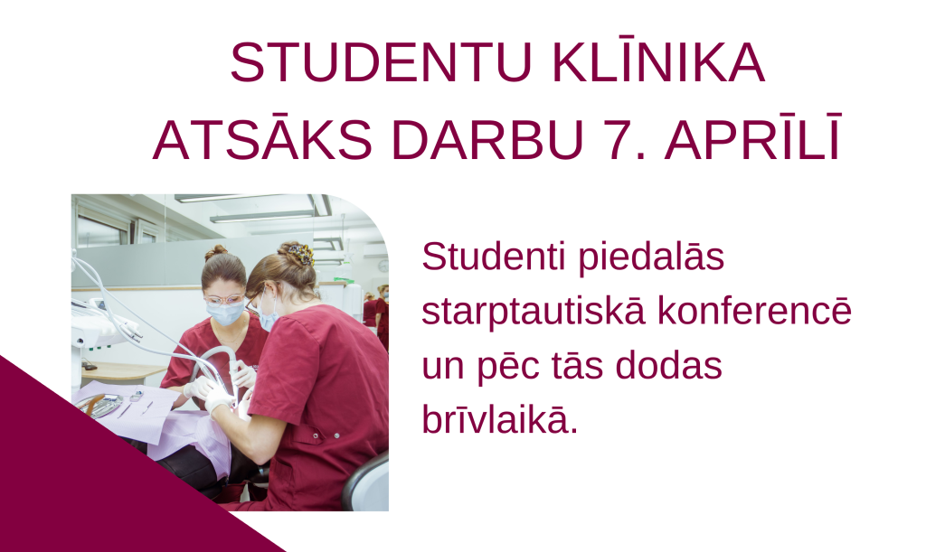 Aktualitātes Studentu klīnikas darba laika izmaiņas Informējam, ka Rīgas Stradiņa universitātes Stomatoloģijas institūta Studentu klīnika laika posmā līdz 2026. gada 7. aprīlim ir slēgta. Šajā laikā studenti piedalās starptautiskā konferencē, kā arī atrodas studiju brīvlaikā. Studentu klīnika atsāks darbu 2026. gada 7. aprīlī. Atvainojamies par sagādātajām neērtībām un pateicamies par sapratni.