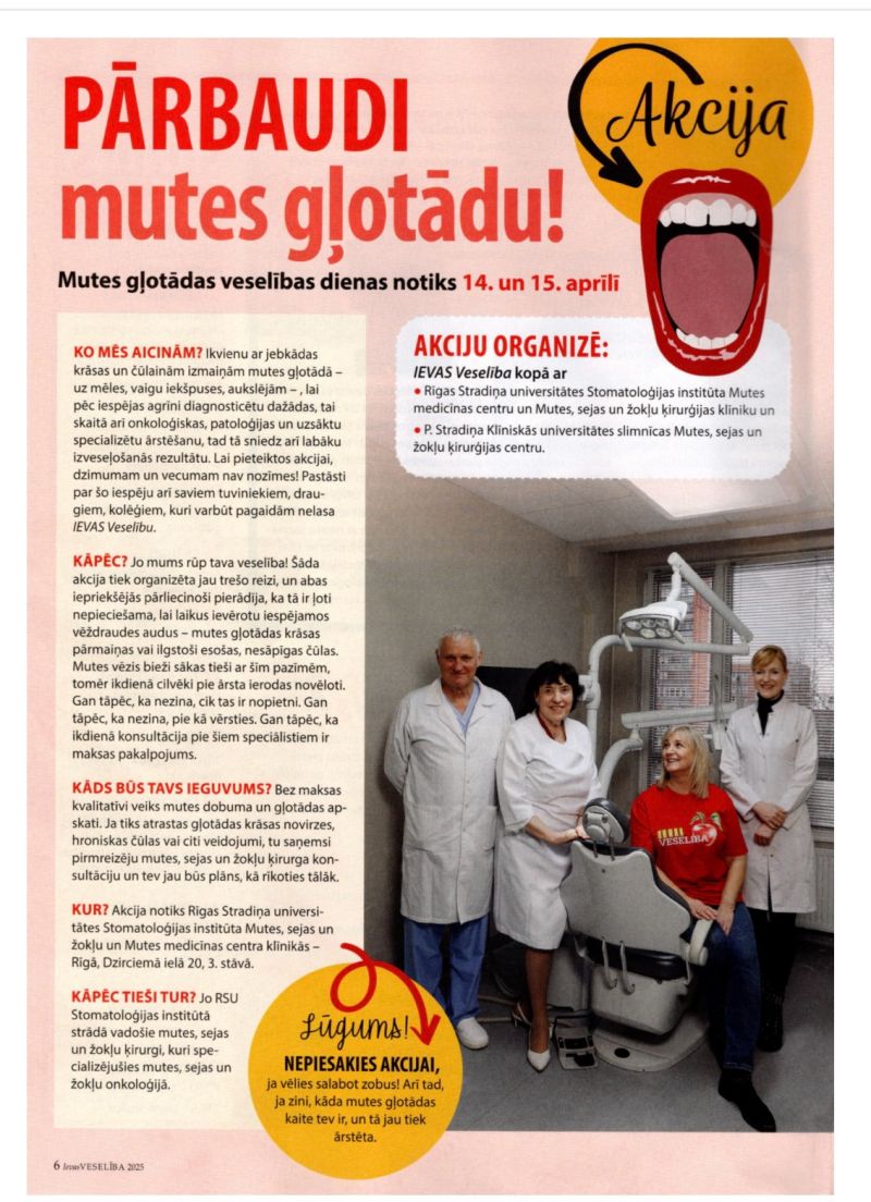 Pakalpojumi Mutes medicīnas centrs Mutes medicīnas centrs ir vienīgais specializētais centrs Latvijā, kurā nodarbojas ar mutes gļotādas dažādu čūlu, bakteriālas, sēnīšu un vīrusu infekciju diagnostiku, kā arī vezikulozu un bullozu slimību, vēždraudes un ļaundabīgo audzēju, alerģisku reakciju, dedzinošas mutes sindroma, siekalu dziedzera traucējumu, sistēmu slimību izpausmju gļotādā u.c. slimību diagnostiku un ārstēšanu. Diagnostika ietver arī patoloģiju atklāšanu sejas ādā un lūpās. Mutes patoloģiju diagnostikā tiek pielietotas mūsdienīgas tehnoloģijas, kas norāda uz morfoloģiskām un bioķīmiskām izmaiņām audu fluorescencē (autofluorescences iekārta VELscope) un siekalu tests agrīnai vēža diagnostikai. Mutes medicīnas centra galvenie pakalpojumu veidi:pacientu konsultācijas un ārstēšanazinātnisko pētījumu realizācija Centrā strādā augsti kvalificēti speciālisti (mutes, sejas un žokļu ķirurgi un zobārsti) ar pieredzi mutes gļotādas slimību diagnostikā un ārstēšanā. MUTES MEDICINAS CENTRA AKTIVITATES Speciālistu raksti vietējos medijos/presē Pagājušās mutes gļotādas veselības dienas 2025